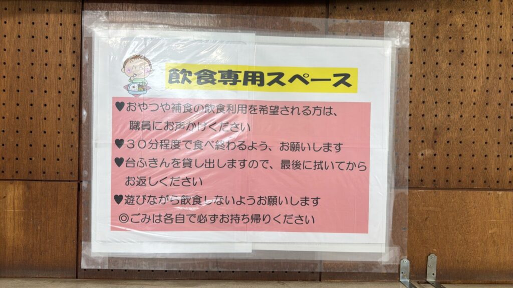 隣には乳幼児専用の飲食スペースもあり、離乳食やおやつタイムにも対応できます(職員への声かけが必要)。